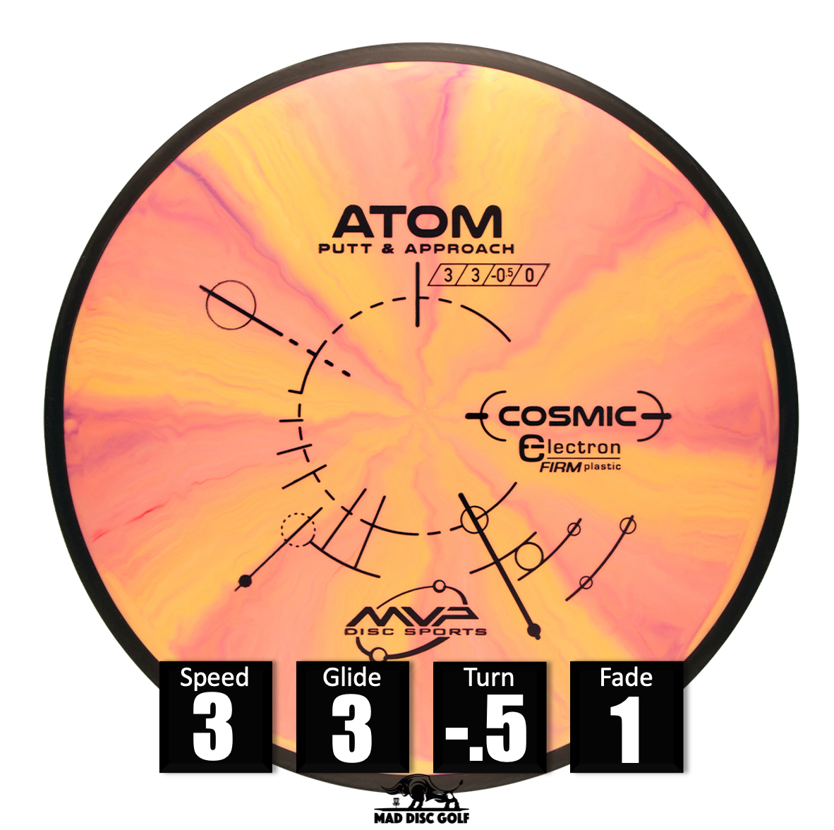L'Atom és un volant recte amb un potencial enorme des del tee i en aproximacions llargues. Des del primer moment, l'Atom té una estabilitat neutra amb una mica de fade. En plàstics premium GYRO® l'Atom mantindrà la seva estabilitat neutral indefinidament. En plàstic Electron baseline, l'Atom esdevindrà un putter extremadament recte i flotant, amb una resposta tàctil extra dins del cercle o en condicions meteorològiques adverses.